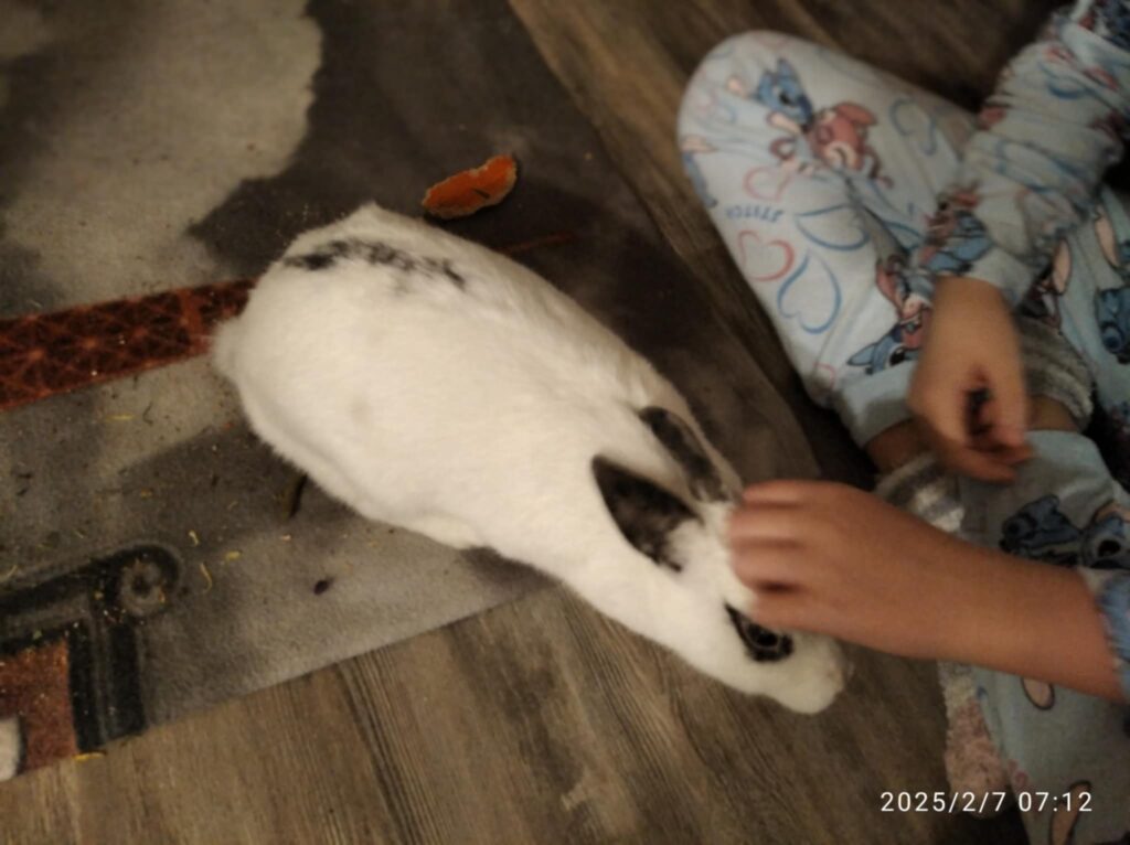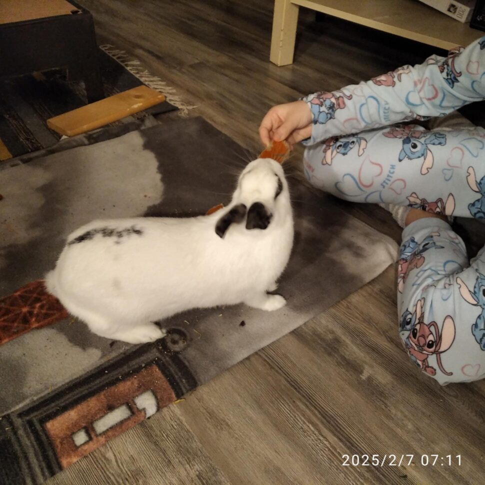 a tak jsme si více než před rokem přivezli zakrslého králíčka. Naše obavy spojené s povinnostmi s pejskem se však naplnili ve chvíli, kdy jsme zjistili, že o králíka se nemá zájem také příliš starat. Říká, že její péče spočívá v tom, že se s ním mazlí a hladí 🙂. Když se nad tím zamýšlím, tak je to vlastně to nejvíc, co si vzájemně mohou dát – bezpodmínečnou lásku.