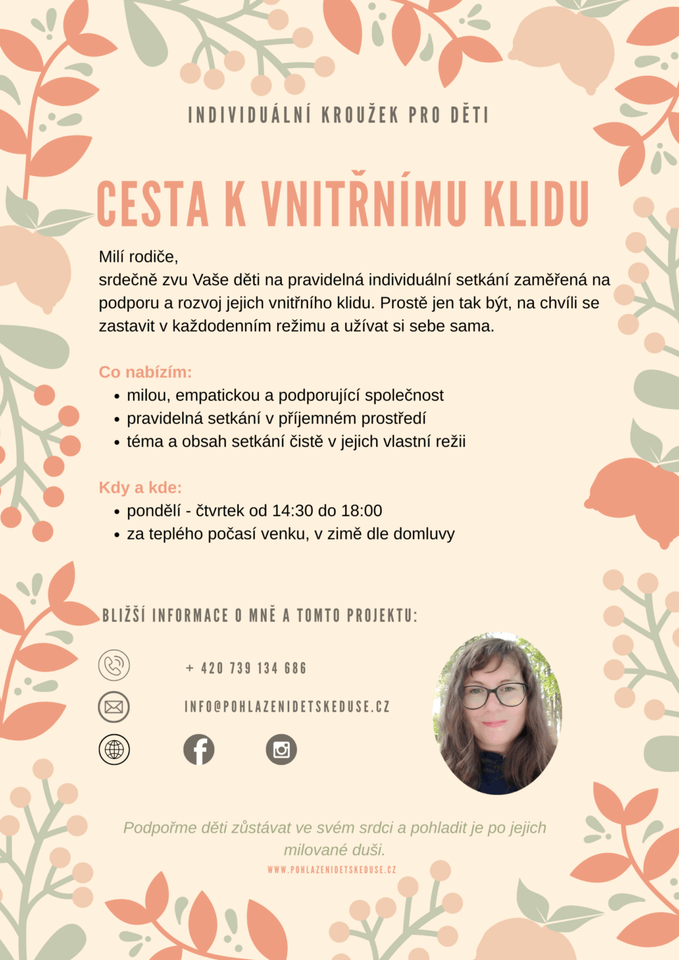 Jeho podstatou je ŽÍT PŘÍTOMNOSTÍ, TVOŘENÍM, SDÍLENÍM, NASLOUCHÁNÍM, ZASTAVENÍM SE a tím děti vést do jejich vnitřního klidu, který je pro nás tak moc významný.